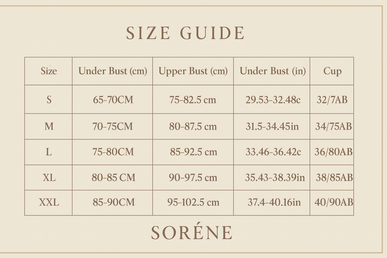 Our bras are designed to follow your natural shape. Simply choose your usual top size — the stretch-fit fabric adapts to your body for a perfect fit. If you’re between sizes, we recommend sizing up for extra comfort.
